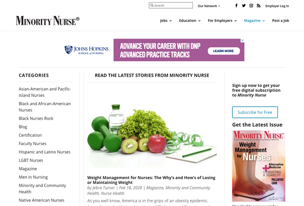 This blog brings inclusivity and diversity to the forefront, with content categories for different groups, such as Asian American and Pacific Island Nurses, Men in Nursing, Native American Nursing, and many others. Authors come from a variety of communities and bring unique perspectives, with blog posts like “Using LinkedIn to Accelerate Your Career,” “Six Steps to Being a Better Nurse Communicator,” “Educate Yourself About Retirement Planning Now,” and “The Importance of Teaching Nursing Students How to Cope with Their Mental Health” a post that takes a deep dive into the issue of mental health for healthcare workers.